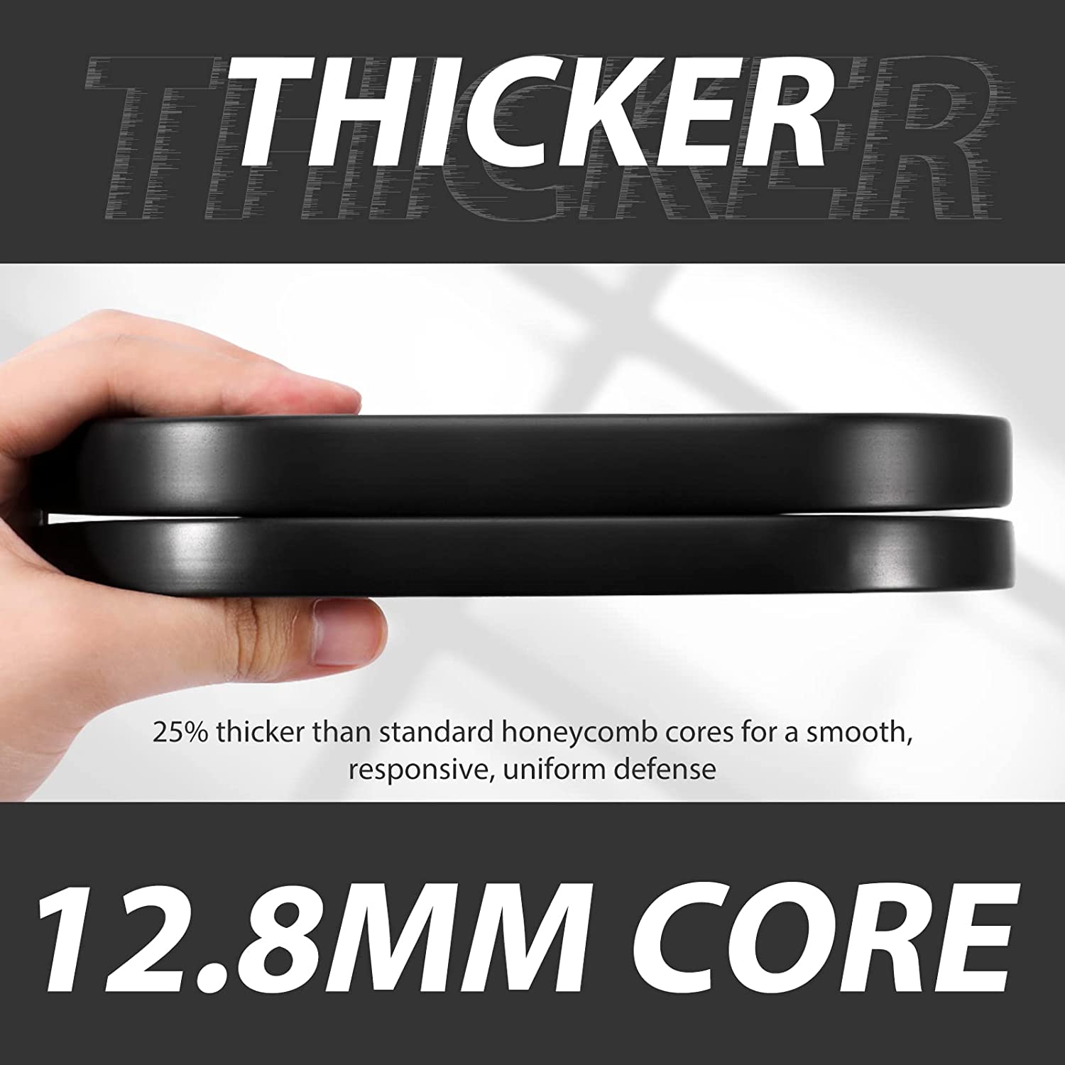 - šćTHICKER 12.8MM COREć Reliable and proven technology paired with the 12.8mm polypropylene honeycomb core gives you a smoother feel. The 25% thicker core absorb the vibration from each hit and yield unwavering speed.