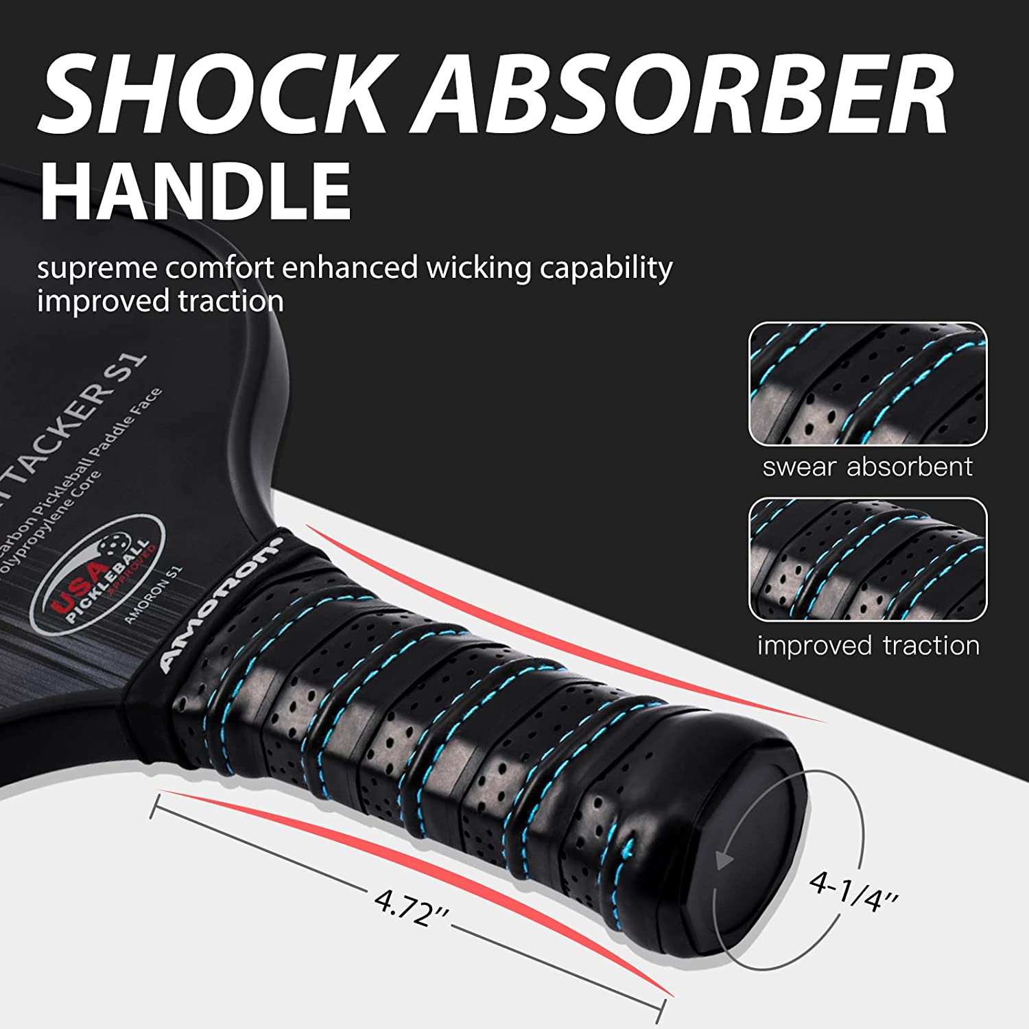 - šćSHOCK ABSORBER HANDLEć Combined the grip with 4.25"circumference and 4.72" length. S1 pickleball paddles set use swear absorbent material, designed for the highest level of comfort ā absorbing both perspiration and impacts as they travel from the paddle face to the hand.AMORON S1 pickleball rackets set has passed USAPA testing and is approved for sanctioned tournament play.