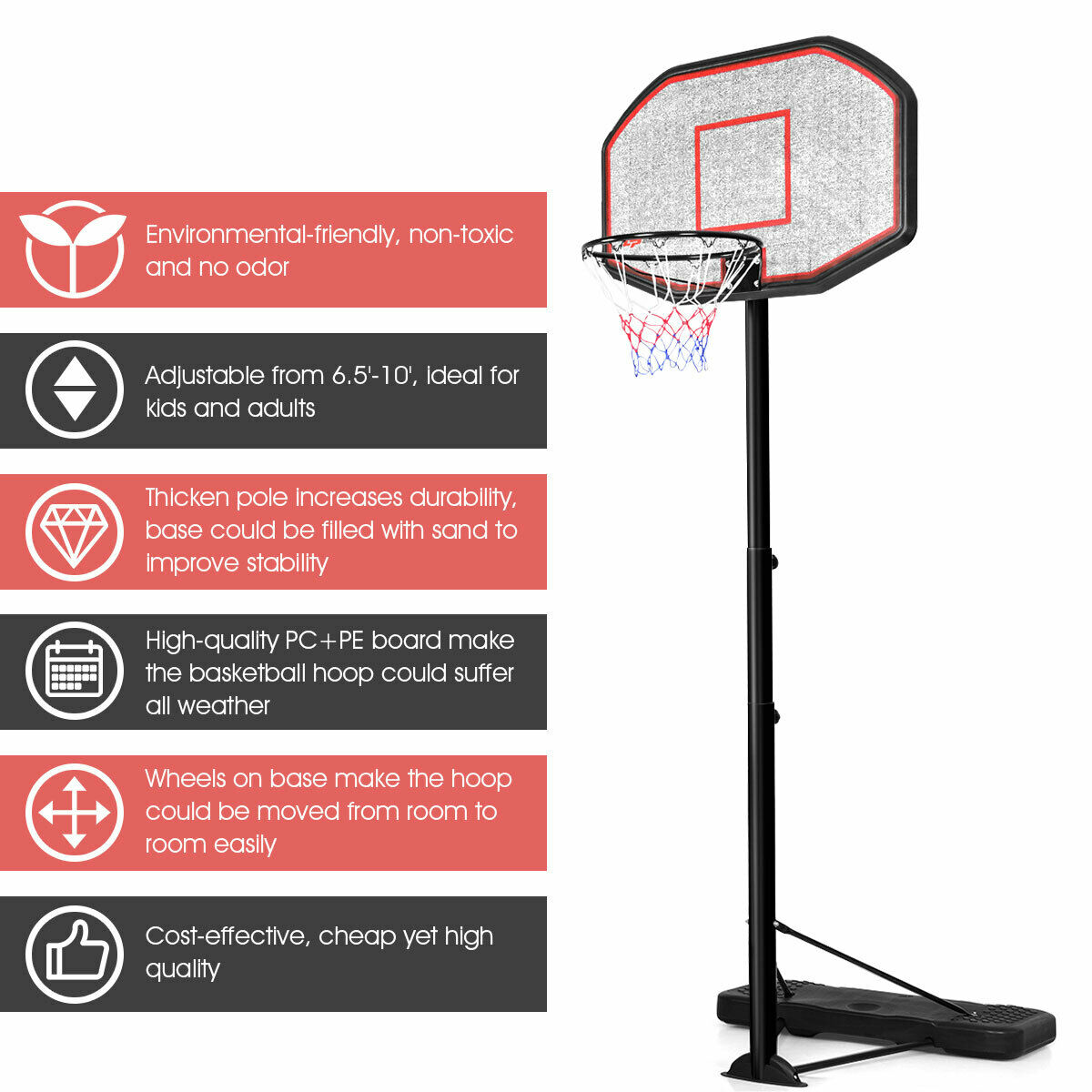 It Is Ideal For Playing Basketball Outdoors With This Full Size Basketball Hoop. The Height Of The Pole And The Rim Can Both Be Adjusted. This Item Is Perfect For Playing Basketball With Your Neighbors, Friends Or Family Outdoor Or Indoor Due To Its Easy Portability With The Attached Wheels. The Base Can Be Filled With 66 Lbs Water And 88 Lbs Sands To Keep It Upright And Stable. To Enjoy Your Energetic And Safe Sports, Choose This Without Hesitation!