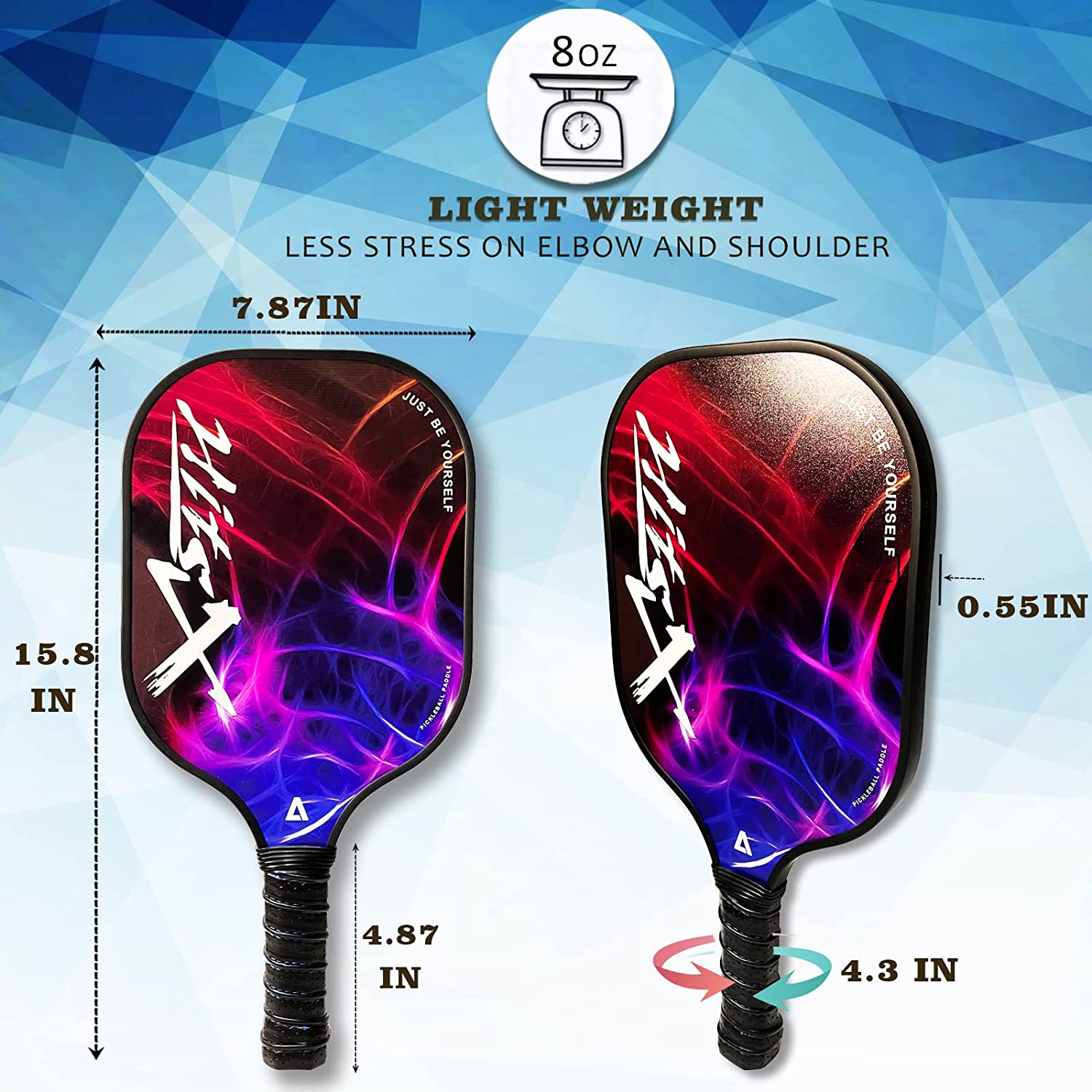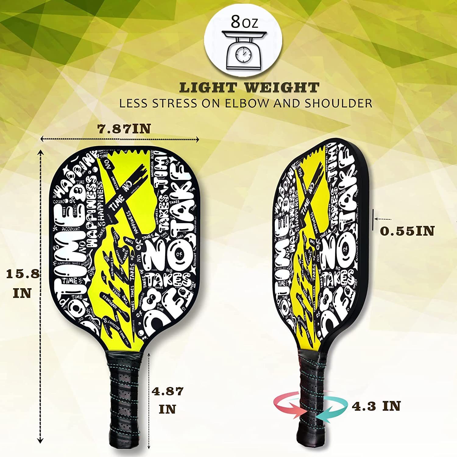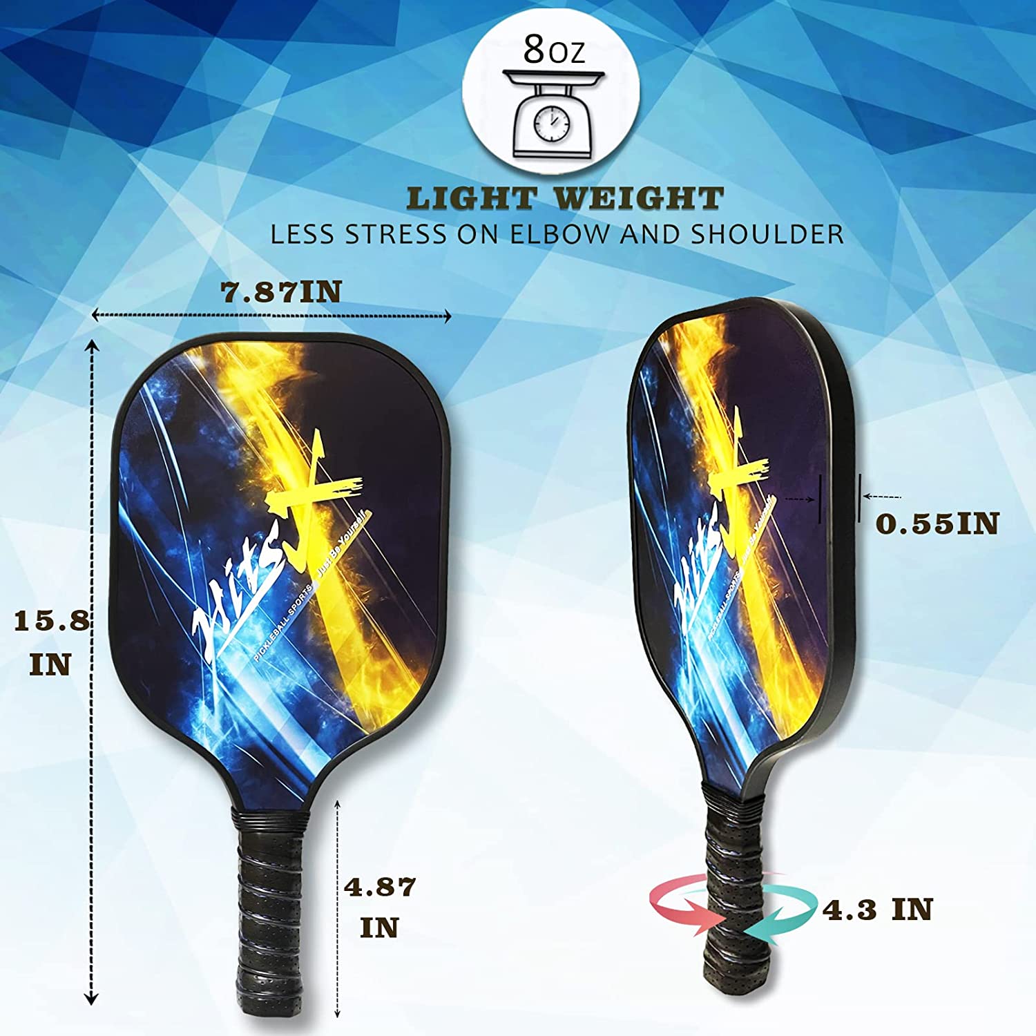 - ●【Size】: Paddle face:10.93"L x 7.87"W x 0.55"H; Grip: 4.87"L and 4.3" circumference. Wide body makes it has as large a perfect ball control area as possible. ●【Paddle Weights】:Only 8 oz! Easy to swing and will not put more pressure on your wrists, elbow and shoulders, which allows for a longtime play without fatigue.