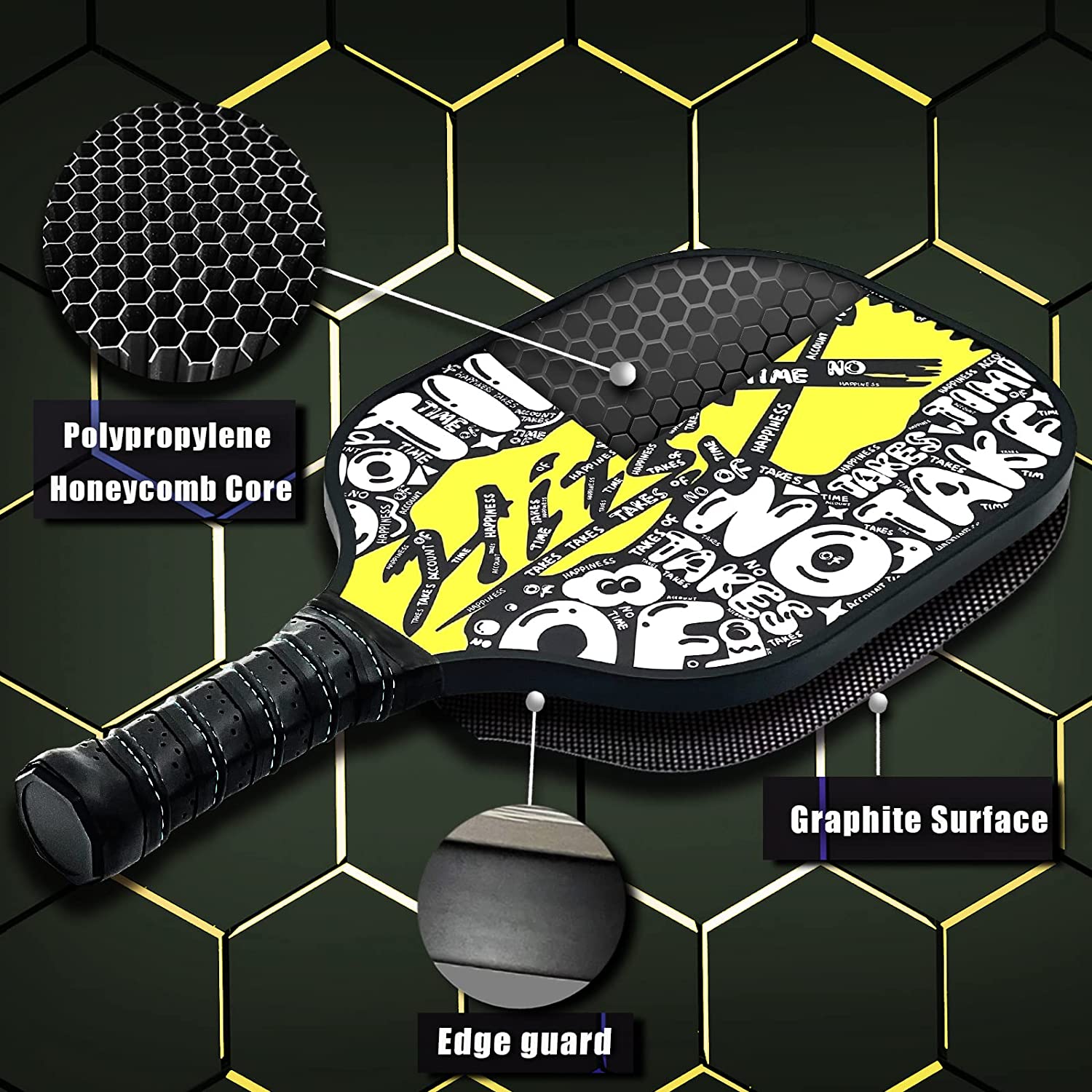 - ●【Paddle Material】:Durable graphite surface, which has excellent strength and stiffness, gives these paddles ideal longevity. It offers accuracy, great ball spin and can withstand strong strikes from the balls; The inside polypropylene honeycomb core is softer and has larger honeycomb cells, which makes it lighter, quieter and has great power.