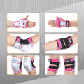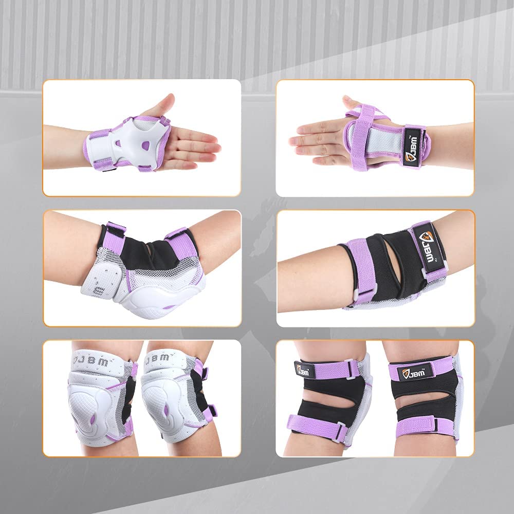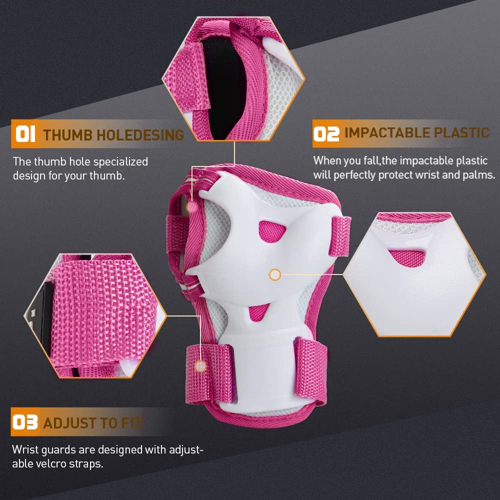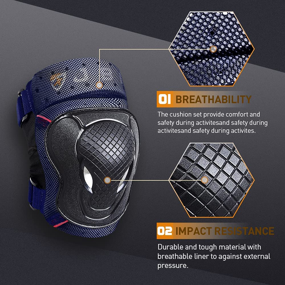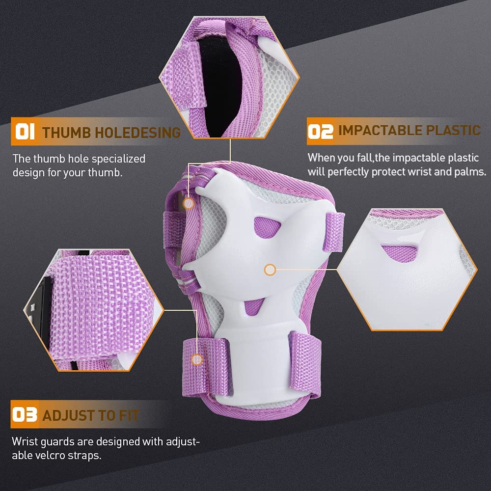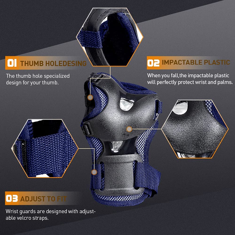 - Wrist Guards with Adjustable Strap - The elastic straps are flexible to fit different sizes of knee elbow and wrist, and there is spandex material behind all knee and elbow pads which can hold the skate pads in place fit for various knee girths. So you can slide them on and then use the straps for a snug and appropriate protective fit.