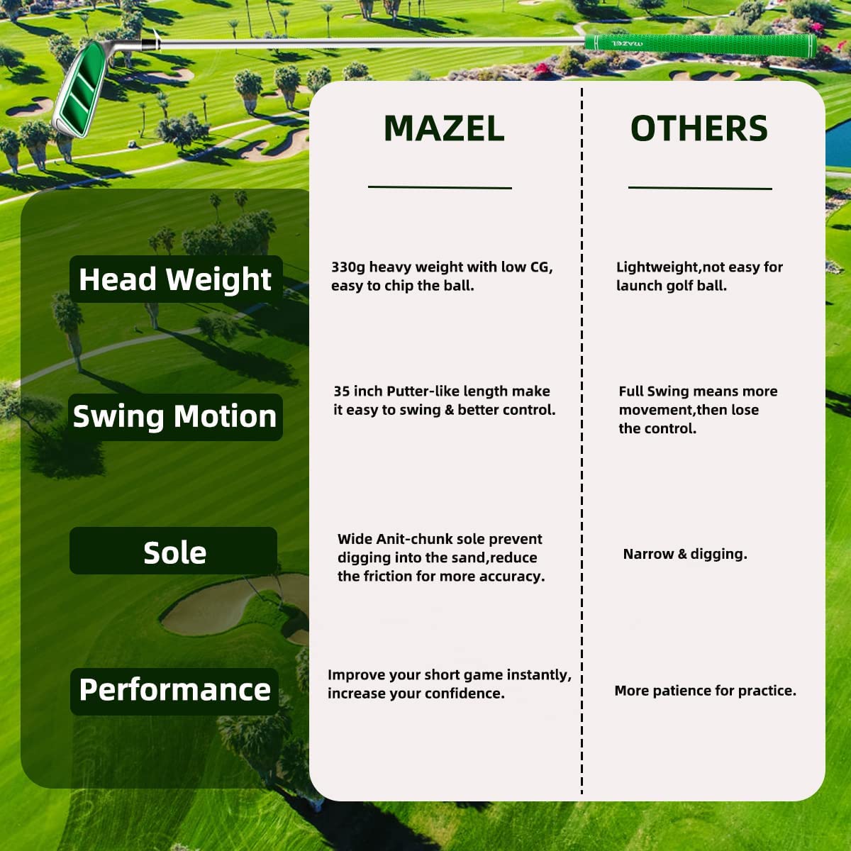 - 🏌️♂️IMPROVE YOUR SHORT GAME: This MAZEL chipper wedge is specially designed for those golfers who struggle with short game,effectively eliminated thin and fat chips shots from the fringe and around the green compared with the traditional irons,give you more confidence and improve short game instantly.
