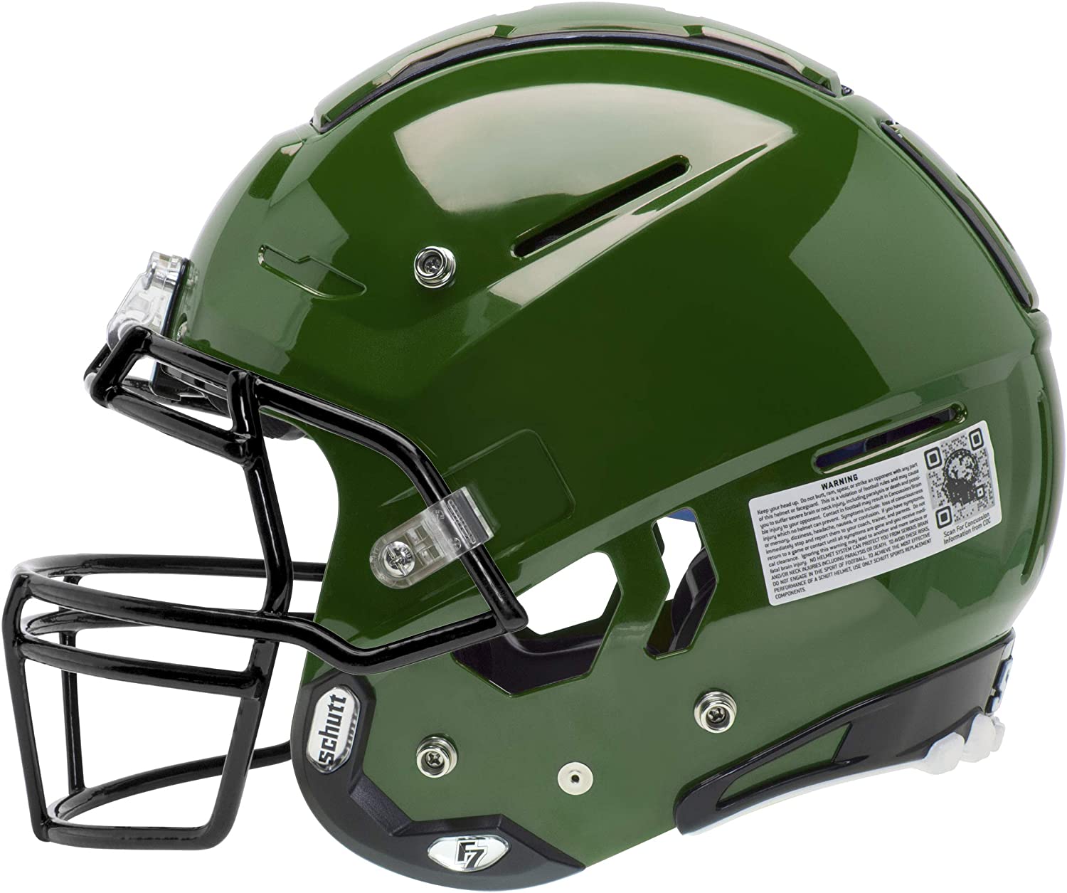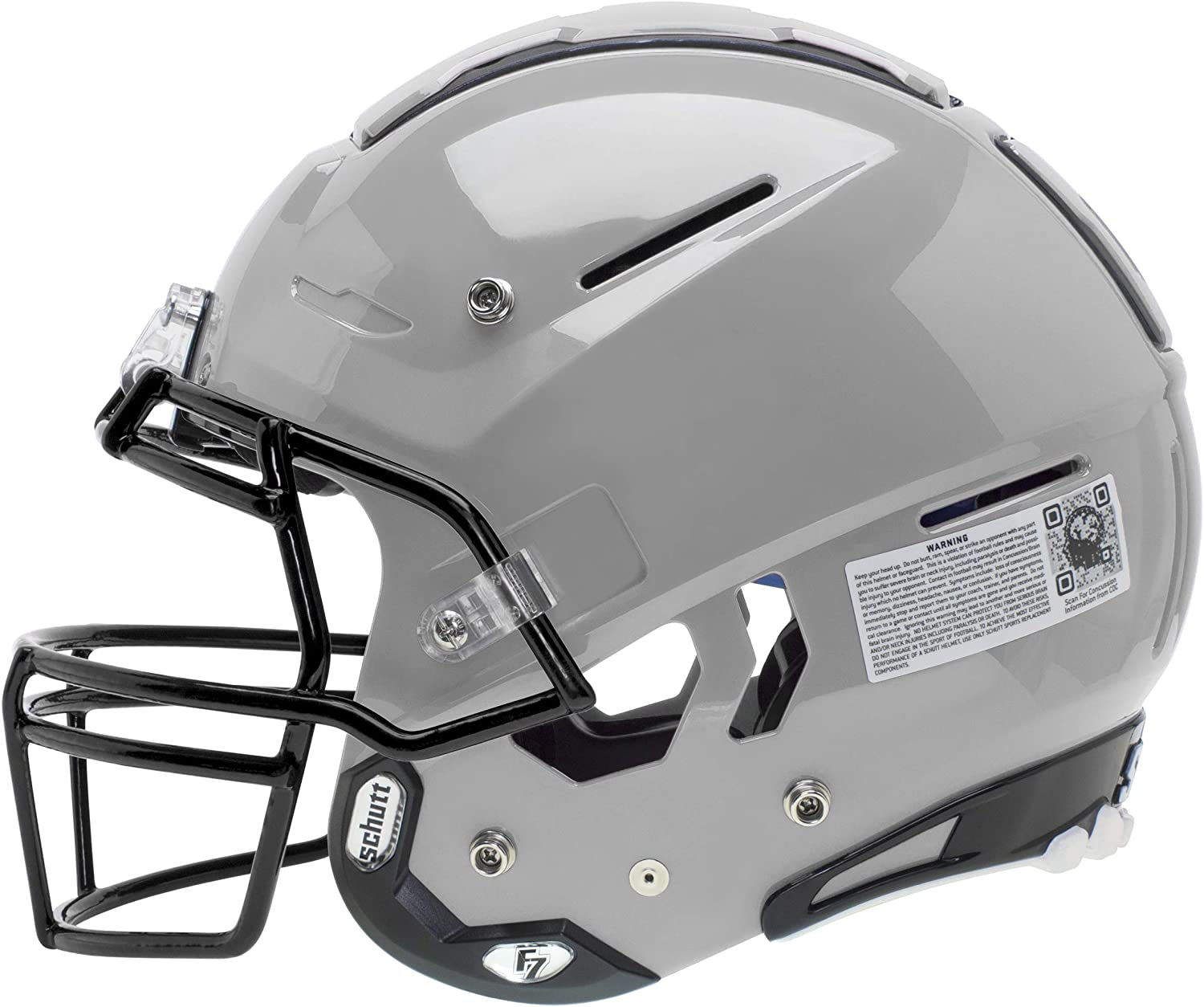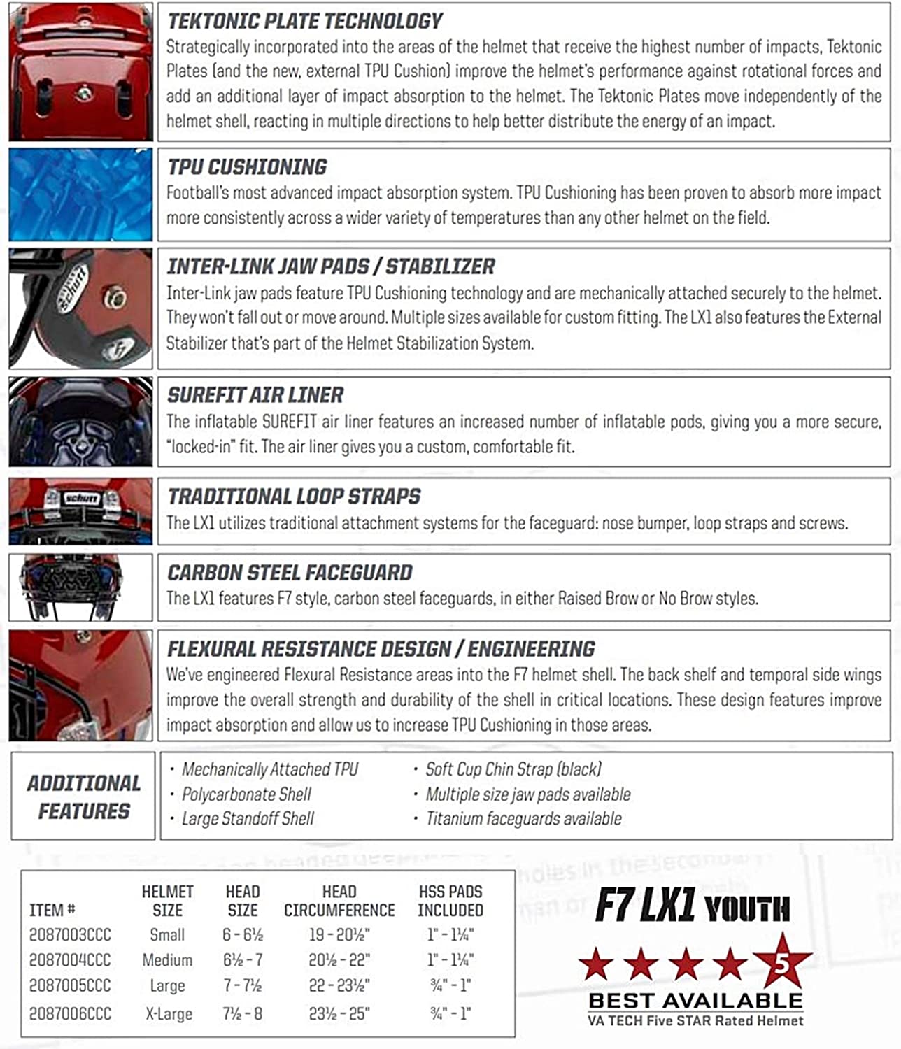 Schutt Sports F7 LX1 Youth Football Helmet comes Standard with a Carnbon Steel Guard and Black soft-cup chinstrap. TPU (thermoplastic urethane) Cushioning – the most advanced impact absorption system in football. TPU Cushioning is proven to absorb more impact across a wider variety of temperatures than any other helmet on the field. 3-Dimensional Movement Tektonic Plates – strategically located in the most impacted areas of the helmet, Tektonic Plates incorporate an additional TPU Cushion and move independently of the helmet, in multiple directions, improving the helmet’s performance against rotational forces. Helmet Stabilization System – Incorporating a larger, more comfortable jaw pad configuration, the HSS utilizes both internal and external stabilizers, high performance impact foam – which is wrapped in soft, durable and comfortable synthetic leather. The HSS frames your face and gives you a secure, “locked-in” feel inside the helmet. Multi-Layer, Integrated Liner System – featuring a non-inflatable lateral air liner, along with a non-inflatable Comfort Fit Liner in the crown, as well as the Radial Diffusion System (RDS) liner. This system improves independent movement of the liner, TPU Cushioning and the head, resulting in better fit and improved performance against rotational forces. Flexural Resistance Shell Design – engineered into the back shelf and temporal side wings of the shell, these design approaches improve the structure, strength and durability of the shell, while increasing the area for TPU Cushioning in those high impact areas and improving impact absorption. High Performance TPU Front Pad – this two-piece, molded front pad is comfortable and features dual-layer TPU. NOTE: Facemask NOT included.
