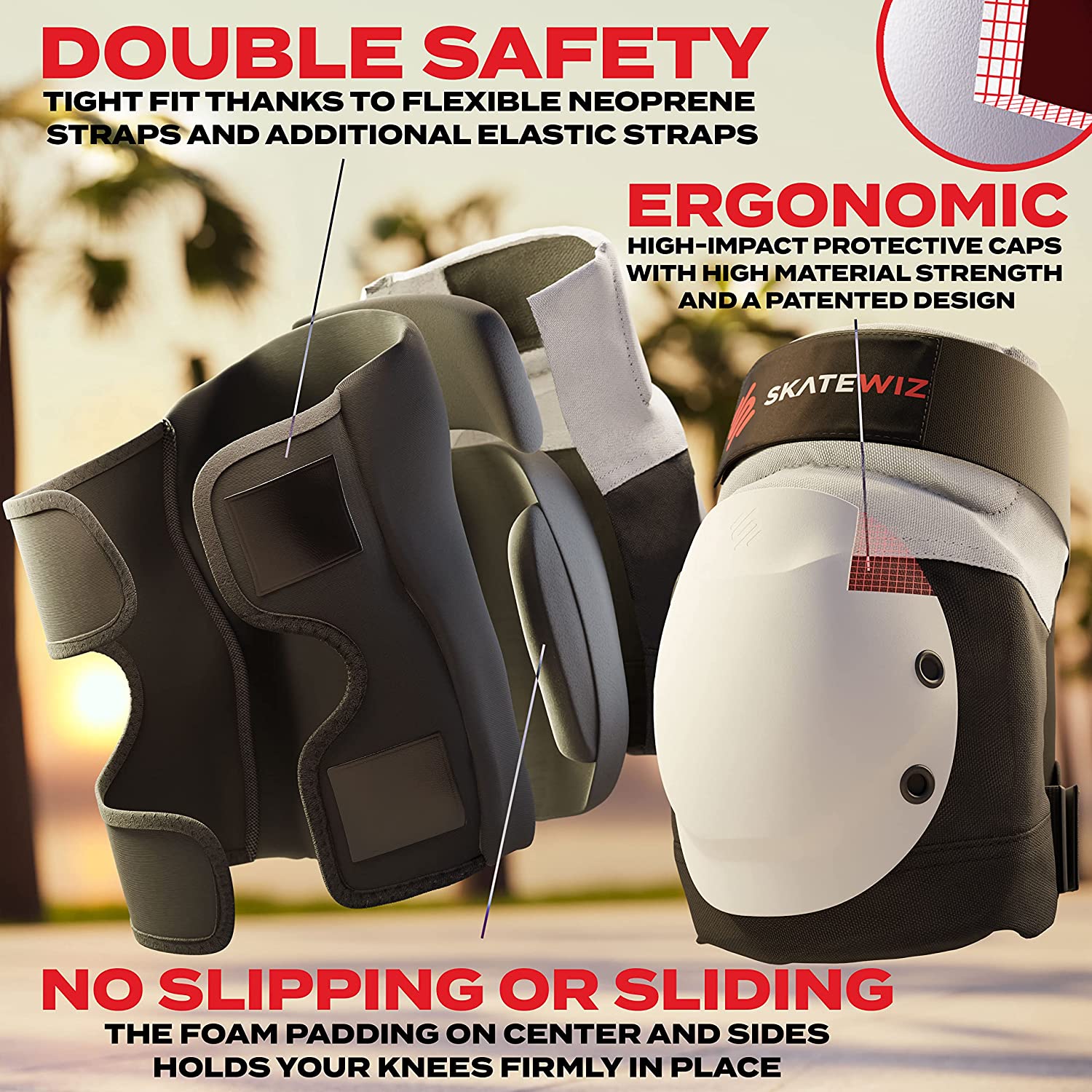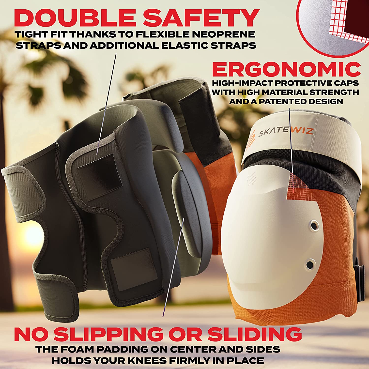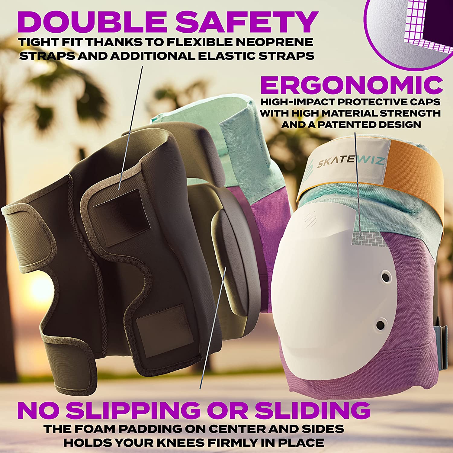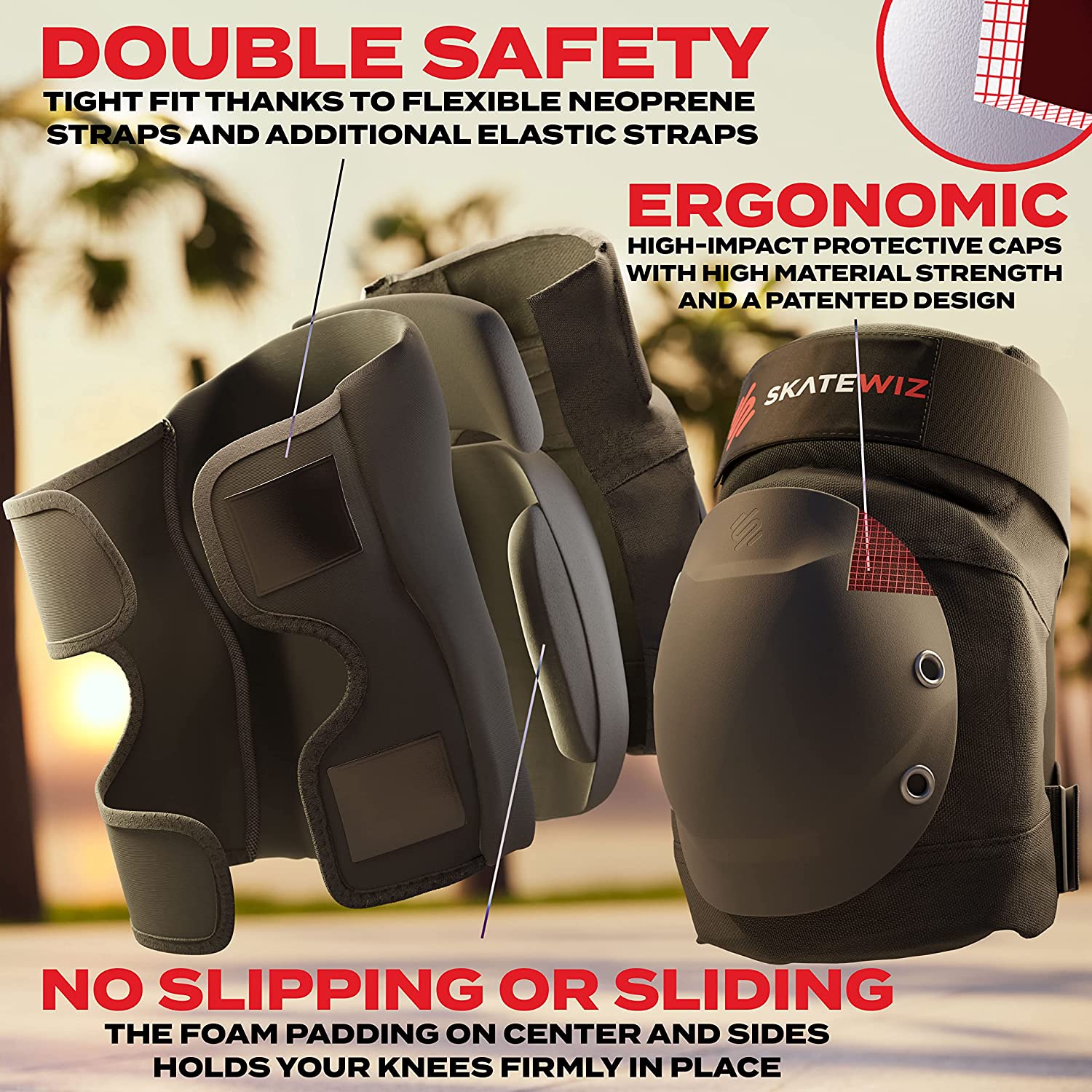 - SHRED IN SAFETY – Make sure your joints are protected before you pull on your roller skates or step on your board. Cover your wrists, knees, and elbows with 6 expertly engineered pads from SKATEWIZ