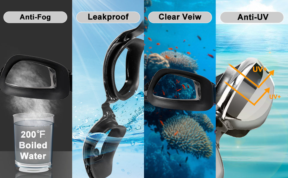 - ADVANCED ANTI-FOGļ¼The swimming goggles is coated with the advanced anti-fog protection and specially designed shatterproof lenses. Anti-fog protection gives you a clear and long-lasting vision in the water.