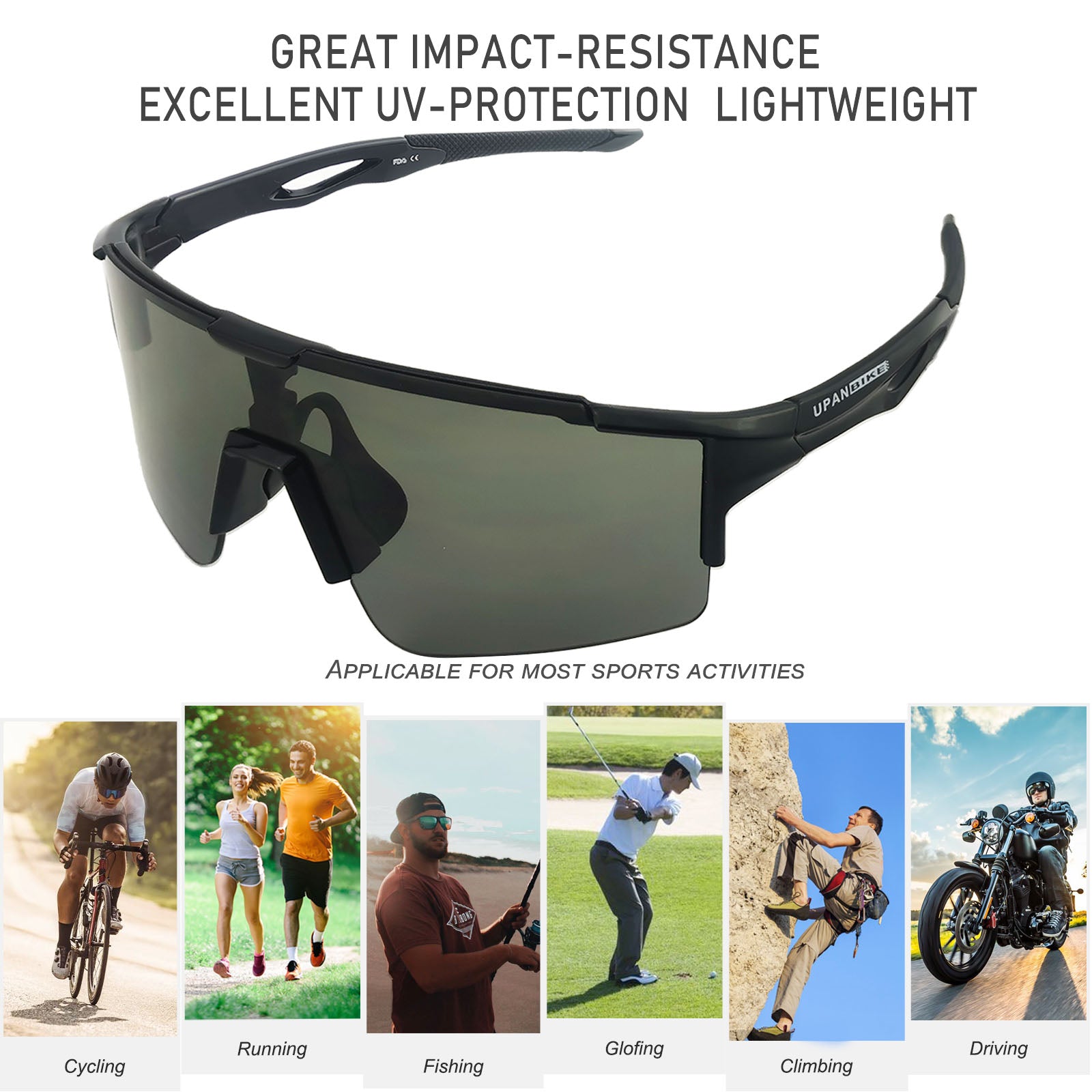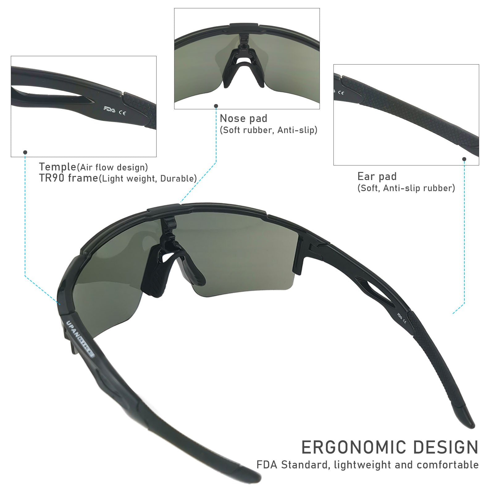Unbreakable TR90 frame: This Sports Sunglasses are very safe for Men Cycling bicycles, Driving, Running, Fishing, Racing, Skiing and Climbing, Trekking, Or Other Outdoor Activities. Lightweight: You can hardly feel them on your face, comfortable. Ergonomic unique design of frame-shaped line leisure sports style, one-piece lens, make it a fashion leisure sunglasses as well. The temples have added silicone foot covers with anti-slip function. Meet the FDA standards of the United States. The use of environmentally friendly rubber nose pads, no pressure on the nose. Exquisite packing: These sports sunglasses is a good choice as a gift for men and women. Package included: 1 x A pair of UPANBIKE Y037 sunglasses 1 x Glasses Case 1 x Drawing Bag 1 x Cleaning Cloth